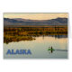 荒野で一人でカヌーはアラスカのインテリアにある湖の鏡の静止した水を汲む。遠くには典型的なタイガと山。文字読の「アラスカ」も登場する。この画像は州魚と野生動物統一されたサービスの写真から派生している。