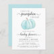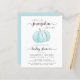 灰色のタイポグラフィとスウェッシュの台本フレンドリーに「甘い小さなかぼちゃが彼の道にある」を特集したキュートで陽気で予算の多いカップルの男の赤ちゃんシャワー招待とパンプキンのパステルブルーの水色とスタイリッシュて、灰色のとスクリプト。両親とシャワー詳細の名前をパーソナライズシンプルグレーモダンタイポグラフィ。