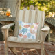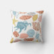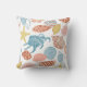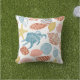 このビーチのようなサマー屋外クッションは、白い背景に青、ターコイズ、コーラルピンクの色合いのカラフルな貝殻のパターンが特徴です。