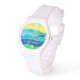 カラフル抽象芸術パタストライプーンのモノグラム名の腕時計。黄色モダン、青ストライプ色、緑の色の抽象芸術の風景。名前やモノグラムでパーソナライズするか、消去する。トレンディーの白いスクリプト。