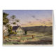 それらの後ろの太陽の設定が付いている背景の木製の塀そして山が付いている3階建ての家の水彩画の絵画。