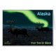 トナカイと呼ばれる二匹の角のある牡牛のトナカイが、冬のために南に移動する夜にツンドラを歩く。地面に霜が降り、遠くの山々の上に北の光が輝く。文字読の「アラスカ」が青と白に表白熱[赤熱]光を放つ示される独自の追加文字を追加。