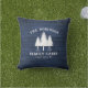 美しく素朴なテーマの屋外パティオ枕で、あなたの名前と"ファミリーキャビン"、牧場、コテージまたは他の文字を特徴とし、その確立された日付と場所の希望ともしして、あなたの国の家をパーソナライズ。このカスタムデザインはユニーク、豊かな青い色の木の板のプリントに松の木の白いシルエットと素朴な田舎のスタイル文字を備えている。この他のデザインを見るには感じ、Zazzle.com/Rustic_Charmにある私の店を無料で訪ねてみよう。感謝してい.