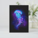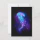 大きく、青く、芸術的に白熱[赤熱]光を放つ、明るいクラゲで、紫色の生物発光を持つ黒い背景に長い触手を持つ。光るクラゲ。