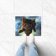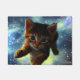 愛らしいジンジャー虎猫の子猫が、AIが生み出したアート宇宙を飛び回る