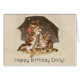 この子猫は1890年のアンティークグリーティングカードのアートイラストレーション。雪の中で二匹の子猫を見せ、冬の天気から保護傘を差し出している。可愛い子猫は可愛らしい甘い猫ベビー!