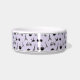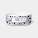 パステルラベンダーの紫色の背景にエッフェルタワー、自転車、バラ、マカロン、クロワッサンパターン(の模様が)あるト、コーヒーカップを黒で特色にしたシックなパリスボウルで、あなたの甘いポーをパンプル。ペットの名前を黒いレタリングでパーソナライズ。