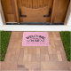 ゲストの歓迎と歓迎エレガントのドーフェミニンマット。背景にピンクの水玉模様を持つ文字「私たちの家へようこそ」を特集したカスタマイズ可能な形式。家族の名前または短い文字を追加してパーソナライズ