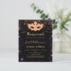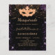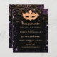 キンセアニラエレガントの15thマスカレードをテーマにした誕生日パーティーのために。黒スタイリッシュい背景。紫飾の金ゴールドグリッターの塵と金の仮装のマスクを持つ名前、年齢、およびパーティー詳細をカスタマイズして追加する。名前は手書文字のスタイルスクリプト