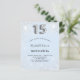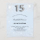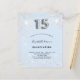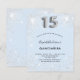 女の子のキンチアネラ(15歳の誕生日パーティー)のためのモダンでスタイリッシュ、そして豪華な招待状。ベビーブルーの背景に、偽のシルバーグリッターが飾られています。名前やパーティーの詳細をカスタマイズして追加できます。数字の15は、風船のようなフォントのスクリプトで書かれています。