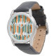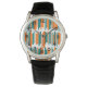 このメンズウォッチは、ティール(緑がかった色)とオレンジ色の線のパターンを持つ。