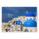 青い屋根の教会は島の至る所にある。都市は険しい山腹を抱えている。サントリーニ。ギリシャ。クレジット:Tom Norring/DanitaDelimont.com