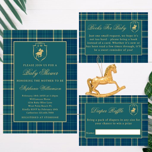 ネイビ名門私立校風のーとハンターグリーンで金ゴールドトーンのアクセントと乗馬と格子要素を持つクラシックの赤ちゃんシャワー招待。馬のシルエットのポロ選手がトップにモノグラムの紋章を飾り、タータンチェックパターンは時代を超越したtouchを加える。クラシック、ヴィンテージ、豪華なオールドマネーをテーマにした赤ちゃんシャワーに最適感じ。おもし前おじいちゃんコア好き、ヴィンテージスタイルこれは赤ちゃんシャワー素晴らし招待状である。プリントとデジタルダウンロードで利用可能。この編カスタマイズ集可能な赤ちゃんシャワー招待テンプレートと自分のイベント詳細。
