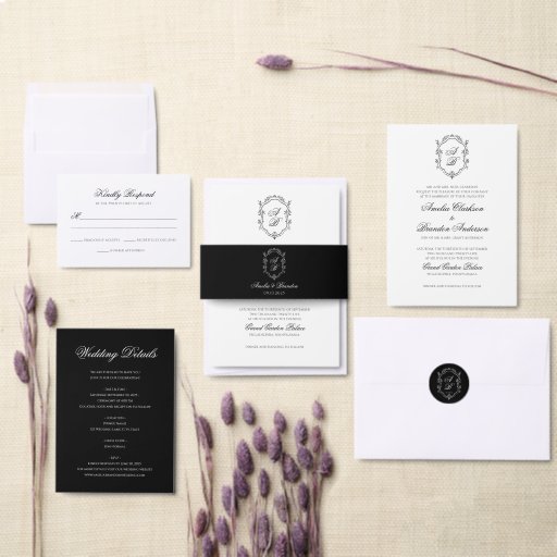 このクラシック伝統的の白と黒の結婚式招待状のベリーバンドは、ヴィンテージ書のスクリプトとフローラモノグラムのクレストとクリーンな時代を超えた洗練されたデザインエレガントを備えている。