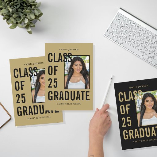 大レタリング「CLASS OF 25 GRADUATE」に囲まれたはっきりしたあなたの卒業生の写真は、あなたの名前と高校で終わった。自分の写真やその他の詳細を後を追の「パーソナライズ」リンクで追加する。編集メニューを使用して、大学院のカラーに合わせてブラックと金ゴールドのカラーを変更することも可能。お願いもしで感じは、お気軽にsusanmingaydesigns@gmail.comまでメールでお問い合わせ下さい。