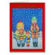 オリジナルおもしろいイラストレーションのクリスマスグリーティングカードには、12月の雪の中でフェスティバルの曲を熱心に歌う3人のかわいいキャロル歌手がいる。雪は彼らのまわりにら降り積もっている包まれたが、彼らは冬の寒さに赤と黄色と赤と緑のニットのストリピー帽やスカーフ保で暖かくなっている。3人の小さな歌手のこのオリジナルのクリスマスの写真ユーモアのあるは、このオリジナルのアートカード上で非常に季節的に見える、色はフェスティバルの応援とスマイルを持って来るために素敵で明るいあなたからのクリスマスのメッセージとしてそれを受け取る特別な人々の顔に。このカードはシンプル家族や友人に送るのに適したフェスティバルの短い思慮深い詩を持ち、かわいい子供のクリスマスカードを作る。カードの内側の詩とカードの前面の挨拶「ハッピークリスマス」はカスタマイズ可能で、このクリスマスカードを自分のメッセージでカスタマイズできる。クリスマスおめでとう!