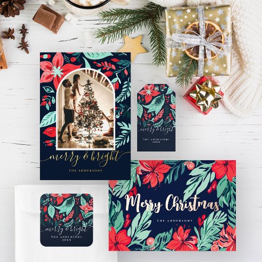 クリスマスウォーターカラーレッドボタニカルブルーホリデー サテンリボン
