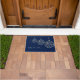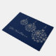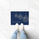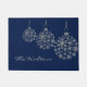 ダークスタイリッシュブルーで行われたホリデードアマット、銀色のスノーフレークのグラフィックとクリスマスボールオーナメント。グレーの文字を読好きなものに合わせる。休暇中にお客様を家に迎える素敵な方法。
