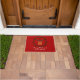 暗い赤い背景にホリーに囲まれたクリスマストナカイの画像。