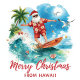 ターコイズの波をサーフィンするサンタが、トロピカルドリンクを手にしている、明るくて水彩のようなイラストは、暖かな海岸のクリスマスの喜びを捉えています。
