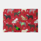 フェスティバルフランスのの休日の服を着たかわいいブルドッグや、赤い背景にが点在するサアーガイルンタハット、セーターなどのクリスマスオーナメントを身に着けている。
