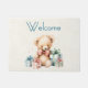 可愛いイラストレーションでスタイルのテディベアをビクトリアン飾ったウェルカムドormat。赤い弓ファンシーを着て。かわい描い古いヴィンテージファッションドスタイルで。赤と青のパステルクリスマスプレゼントがこの暖かい心のクマを取り囲んでいる。
