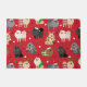 かわいいクリスマス犬のフェスティバルの休日の服装。ポメラニア犬とクリーム、ブラック、タン、グレーとチョコレートコート衣服サンタハット、〔雄ジカの〕枝角、散在オーナメントの赤い背景にセーターのクリスマスストッキング。