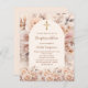 確モダン認のスタイリッシュロマンチックな招待。クリーム、桃の色の背景、アーチのフレーム、クリーム飾色の花付き。名前と詳細をカスタマイズして追加1枚= 1枚の招待状を印刷したエッジからエッジ