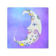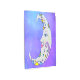 この金属製の壁プリントは白い三日月を持ち、カラフルの模様が円や三角形に描かれ、金ゴールドの星が三つ星と顔に描かれ、星の紫の空に描かれ点々のあるている。