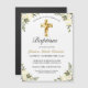 そのかわいらし隅には緑の植物性の優しい色のバラが葉置かれている。金ゴールドの上部中央に十字架が目立って表示されるデザイン。このカスタマイズバプテスマの招待は、あなたの男の赤ちゃんまたはベビーガールの情報と。クラシックベビーの特別な神聖なバプテスマに最適だ伝統的。