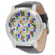 この男性用ウォッチは、色の付いた正方形とモダン長方形のグリッドの半デザインを持つ。また、グリッド線に配置された色の付いた円もある。あなたはもしデザインが好きだが、色違うを好む、メッセージ私。