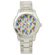 この女性の時計は、色の正方形と長方形モダンを持つグリッドの世紀半ばのデザインを持っている。また、グリッド線に配置された色の付いた円もある。あなたはもしデザインが好きだが、色違うを好む、メッセージ私。