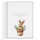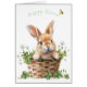 愛らしいイースターバニーは、クローバーとタンポポのパフで満たされた木製のバスケットに座っている。内側にはバニーがスミレと粘土のポットに座っている。