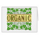 緑のスローガンオーガニックは、庭師、調理師、地球の日のお祝いのための飾、資本文字で、どんぐりやオークのの背景に葉、資本文字で、スクロールのに囲ま葉れてる。