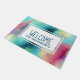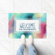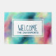 ウェルカムマットとカッコいい抽象デザインスタイリッシュ。水の色が混ざり合って混ざり合い、イメージの錯覚を作り出す宇宙。緑と紫、黄色、明るい赤の渦巻きが白い点と星のスマタリングと混ざり合う。作カッコいいトリップ(幻覚体験)のような成。白い長方形が上に重なり、「welcome」という単語と名前が内側に表示される。