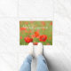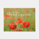 鮮やかで赤いケシが付いているドア・マットはケシの緑分野で十分に開花します。 それはhapiness、春および夏の強い感情を有します。 それは文字と来ます: 白の「歓迎」。