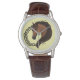 黄色を背景に円形に部族ポートレートを持つ茶色の馬側ケルト結び目模様プロファイル