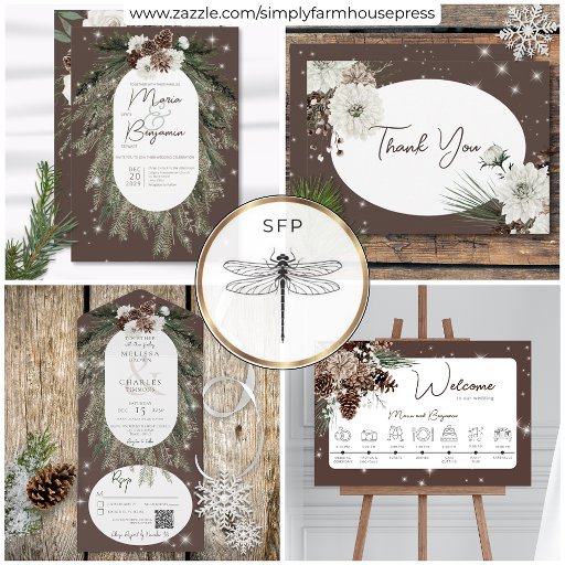 このデザインは、白い花を持つココアの背景に素朴な緑の松とピネコンの花束を備えている。美しい冬の休日の魔法を描くために、白い輝きのオーバーレイでアクセントを付ける。クリスマスや冬の結婚式に最適。このカードはCocoa Pine Winter Sparkle's Suiteの一素朴部であ結婚り、Simply Farmhouse Pressによって作成された。