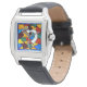 女性の完璧な正方形の黒い革のストラップ腕時計の腕時計ステンドグラスの神の像ココペリ。ココペリは豊饒の神で、通常羽やアンテナのような突起を頭に浮かべて背中に膨らんだフルート奏者として描かれ、南西部州の先住民アメリカ文化に崇拝され統一されたている。多くの豊饒の神々と同様に、ココペリは出産と農業の両方を司っている。彼はトリクルスターの神でもあり、音楽の精神を表している。マッチングボタン、チャーム、大型プレミアムキーチェーン、正方形アクリルキーチェーン、ネックレスを参照。ACCESSORIESセクションのArizona Watchコレクション全体を参照。