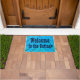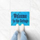 "コテージへの歓迎"の青く素朴な木製の一見 ドアマット