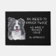 「2回ノックする必要はない、私たちはコリーを持っている縁ど」とこの可愛いドアマットを言う。文字は右側がシルバーグレイで、その右側には白と黒縁どのコリーのイメージが離れある。すべて黒い背景に置かれる。