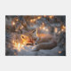雪の中で静かに眠る赤いキツネの穏やかなイメージで冬の魔法を体験し白熱[赤熱]光を放つ、妖精の光と雪に覆われた松の枝の下の素朴なランタンに囲まれた。