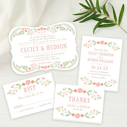 コーラルピ素朴ンクとグリーンのフローラ結婚ズ 招待状