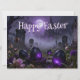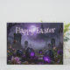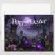 霧に包まれた墓地を舞台に、紫色に発光する卵とゴシック様式の大聖堂が背景に描かれた、神秘的なイースターのシーン。暗い色調、もやのかかった雰囲気、そして不気味な照明が、伝統的なイースターのイメージに独特で、忘れられないような、ひねりを加えている。