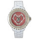 この腕時計は、白い骨と白いスカルで縁取られたゴシック様式の暗い赤いハートを持ち、ハートの中央に白い螺旋線が付いた赤い背景に白い縁取りを持つ。