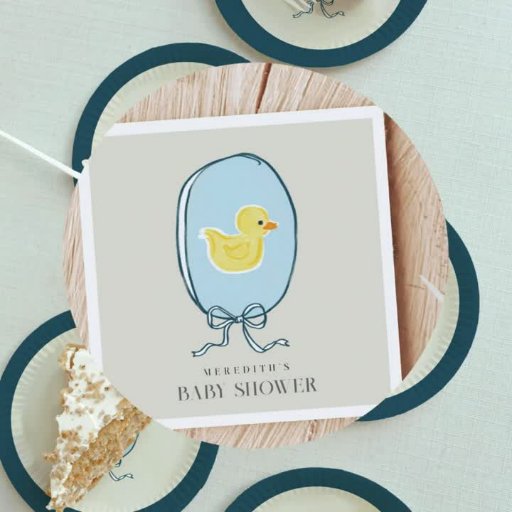 リボンエレガント枠の中に手描きラバーダックを取り入れた甘い赤ちゃんシャワー差出人住所ラベル。そのタイポグラフィはシックでエレガントある。