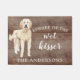 濡れたキスおもしろいサーに注意"素朴な背景に設定されたゴールデンDoodle犬のドアマフェイクット。私たちの店を訪問し、犬のパンの大規模な品揃えを見る