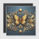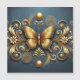 対照的な青芸術的い背景に華美フローラと装飾的なカールに囲まれた金の蝶の描写エレガント、豪華さ、優雅さ、装飾のテーマを高める。