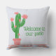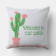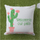 このかわいい屋外の南西テーマの枕は珊瑚のピンクの花が付いている淡いブルーの背景そしてかわいく鉢植えなサグアロのサボテンを食べます。 開いた珊瑚のローズ形ダイヤモンドの最下のボーダーがあります。 草色の文字のnatchesサボテン。 変えることができる文字は言います、"私達のテラスへの歓迎"