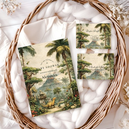 このヴィンテージスタイルの恐竜デザインで、豊かな先史時代の楽園に足を踏み入れましょう。パームツリー、シダ、温かい土色調の優しい恐竜が特徴で、冒険とチャームに満ちたベイビーシャワーに最適です。トロピカルな緑と幻想的なジュラシックの郷愁がタイムレスにブレンドされたデザインです。